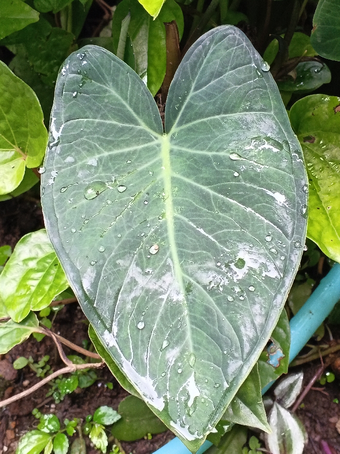 A large, heart-shaped, gray-green leaf dominates the image, speckled with water droplets. Its prominent veins radiate outwards from a central stem. The leaf is surrounded by a variety of smaller green plants with glossy surfaces. Brown soil and small twigs peek through the foliage. A section of a blue pipe is visible at the bottom right, adding an artificial element to the natural setting.