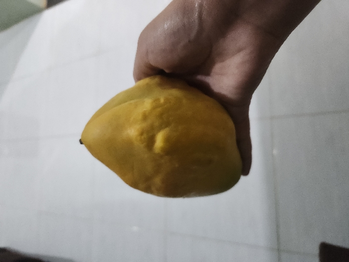 - "A single ripe, yellow, pear-shaped fruit, exhibiting minor surface irregularities and a small dark stem remnant, is held in the right hand of an individual" by FM-2RsKq2, licensed under CC BY 4.0