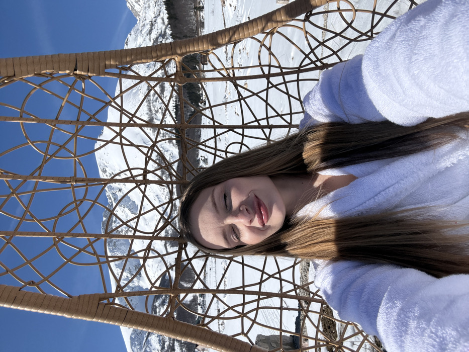 A female subject is seated within a large, light brown wicker-style hanging chair with an open, geometric weave, appearing to capture a selfie. She has long, straight, light brown hair and is dressed in a white terrycloth bathrobe. Her eyes are closed, and a slight smile is visible on her lips, with sunlight illuminating her face and casting a shadow on the right side of her hair. The background consists of a vast, snow-covered mountainous landscape under a clear blue sky. Distant mountains are heavily blanketed in white snow, punctuated by patches of evergreen trees and scattered bare vegetation. The ground in the midground and foreground is completely covered in snow. The scene is located in Motički gaj, Montenegro.