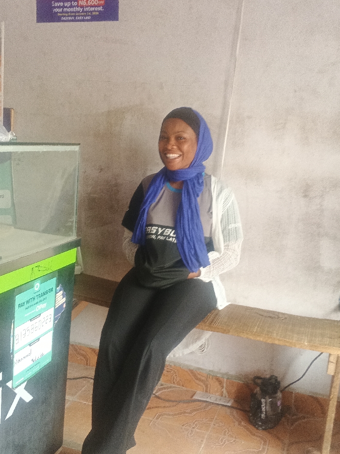 An adult female is seated on a wooden bench inside a commercial establishment in Fagge A, Nigeria. She is wearing a black head covering, a blue scarf, a grey t-shirt with a black overlay displaying partial text "EASYBL..." and "MONEY, PAY LATE...", a white open-knit cardigan, and dark trousers. The woman is smiling and looking forward. To her left, a green and black display stand features a glass top and a green panel with text "PAY WITH TRANSFER," account number "9135880223," and "Mohammed Maimuna." Above her head, a purple sign on a light-colored wall advertises "Save up to N6,600 off your monthly interest" and "EASYBUY." The floor is tiled with a brown patterned design. Underneath the bench, a dark, cylindrical object, possibly a small power device, is visible with a black cable.
