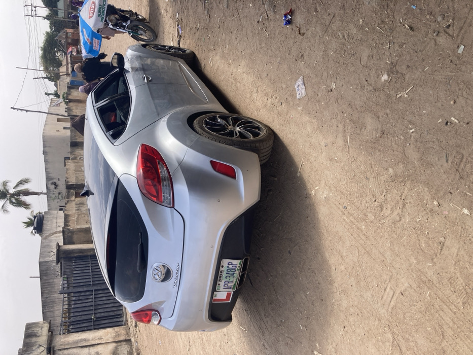 A silver Hyundai Veloster hatchback is parked on a dirt road in Minna, Nigeria, angled slightly towards the right foreground