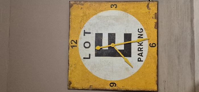 A square clock hangs on a wall. The clock face is yellow with a white circle inside. Within the circle, "LOT PARKING" is printed around a large black "E." The clock has numerals at 12, 3, 6, and 9. The clock hands are yellow, indicating the time is approximately 4:23. The clock has a distressed or vintage appearance with worn edges and faded colors. The wall behind the clock is a neutral tone.