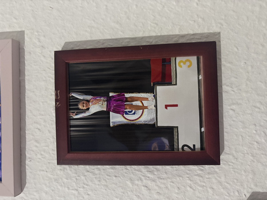 A framed photograph hangs on a textured white wall. The picture shows a young girl standing on the first-place podium with a medal around her neck, arms raised in victory. She wears a long-sleeved white shirt and a shiny purple skirt. Behind her is a black curtain and a banner with writing. The podium is white with the numbers 1, 2, and 3 in red and yellow. Above the framed picture is the edge of another framed picture.
