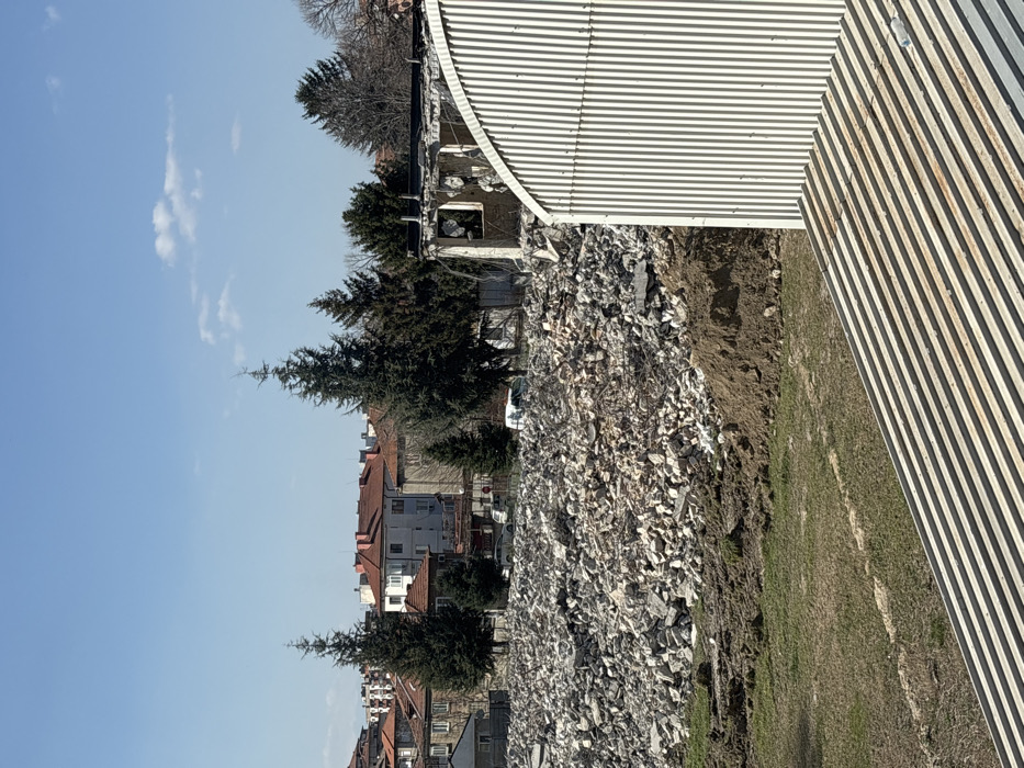 The image depicts a demolition site in Pazardzhik, Bulgaria, under a clear blue sky with minimal cloud cover. In the foreground, the lower right section features a light-colored, corrugated metal structure, likely a roof or wall, sloping diagonally upwards to the right. The ground in the lower-left to mid-left consists of patchy green grass and disturbed brown earth, including small piles of soil. Dominating the midground is a substantial mound of light-colored rubble, composed of fragmented concrete, stone, and other building materials, indicating a recent demolition. Behind this debris pile and partially obscured by the foreground structure, a partially demolished, single-story building is visible on the right, exposing a window opening and internal structural elements. In the background, numerous residential or mixed-use buildings with red-tiled roofs and light-colored facades are visible, characteristic of an urban environment. Several tall, dark green coniferous trees are interspersed among these structures and behind the demolition site, along with some bare deciduous trees. A white vehicle, possibly a van, is discernible on a surface behind the rubble pile, near the center-left background. No individuals or active machinery are visible within the frame. The scene is illuminated by direct sunlight, suggesting daytime conditions.
