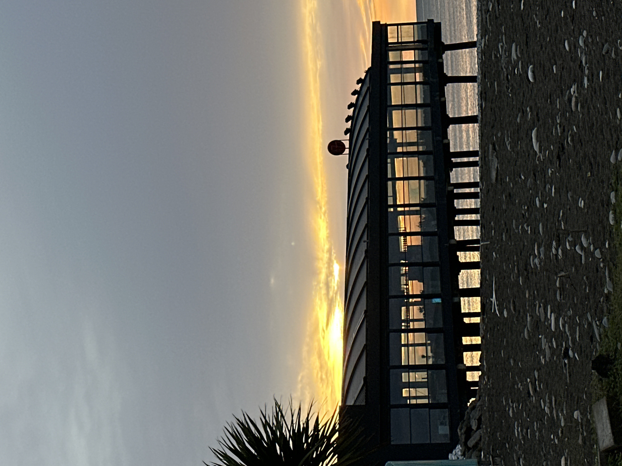 A tall, dark-colored building with numerous windows stands adjacent to a beach. The windows reflect the bright colors of a sunset. To the left of the building, the sky transitions from a light gray to an intense orange and yellow as the sun sets. A palm plant is in the foreground. The beach is dark and pebbly. The building is located in Batumi, Georgia.