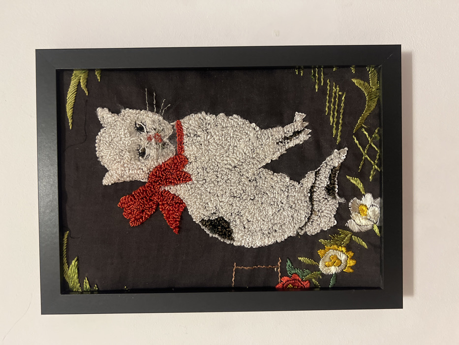 An embroidered artwork is displayed on a plain white wall in Bar, Montenegro. The artwork, framed in a simple black rectangular frame, depicts a stylized cat against a dark background, likely black fabric. The cat is predominantly light grey and white with textured, short-loop or knot-stitch embroidery, suggesting fur. It features small black patches on its back and a hind leg. A prominent red bow is embroidered around the cat's neck. Its face includes black eyes, a red nose, and fine black whiskers. The cat is depicted in a seated posture, facing slightly right. The lower section of the artwork incorporates embroidered floral elements with red, yellow, and white blossoms, along with green leaves and linear green stitches representing ground cover.