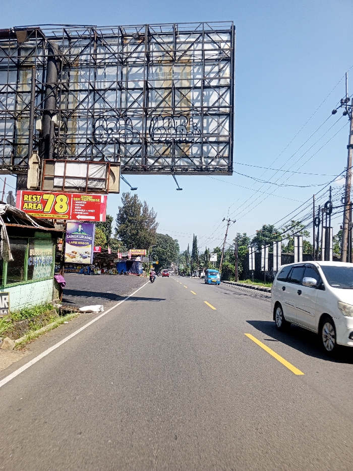 The image displays a daytime view of an asphalt road under a clear blue sky. The road features a solid white line along the left edge and broken yellow lines marking lanes. **Environment:** The scene is a commercial roadside area. Utility poles with multiple wires are visible on the right, extending into the distance. Various trees and some low-lying greenery line both sides of the road. **Subjects/Objects:** On the left foreground, a green building or stall is visible with a partially discernible sign, "BUBUR CIANJUR." A purple fabric object is draped near this structure. Above and to the left, a large, empty metal billboard frame, showing signs of weathering and some faint graffiti, dominates the upper portion of the frame. Below it are several smaller commercial signs: a red sign marked "REST AREA 78" with text promoting mobile phone sales and services in Indonesian, and a blue sign for "SANGKURIANG LAPIS BOGOR." Further down the road on the left, additional roadside stalls and buildings are present. On the right foreground, a white Toyota Kijang Innova minivan is partially visible, moving away from the viewer. A raised curb or sidewalk separates the road from the adjacent terrain. In the mid-distance on the road, a blue minivan is also traveling away. **People:** One individual is partially visible near the green stall on the far left. Another person is observed riding a motorcycle further down the road on the left. **Actions:** Vehicles are actively driving on the road, indicating traffic flow. The overall scene suggests a busy commercial and transit area.