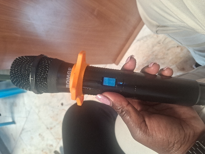 A person's right hand, with dark skin and light pink manicured nails, holds a black wireless BOMGE microphone vertically. An orange, star-shaped anti-roll ring is present below the microphone head. A blue "OFF" switch with a blue indicator light is visible on the microphone's body. A silver-colored watch with a metal band is on the person's wrist. The individual is wearing light-colored trousers, visible on the right. The background features a light-colored tiled floor, a wooden furniture piece on the right, and a dark fabric object on the left. The scene is indoors, located in Muthambi ward, Kenya.