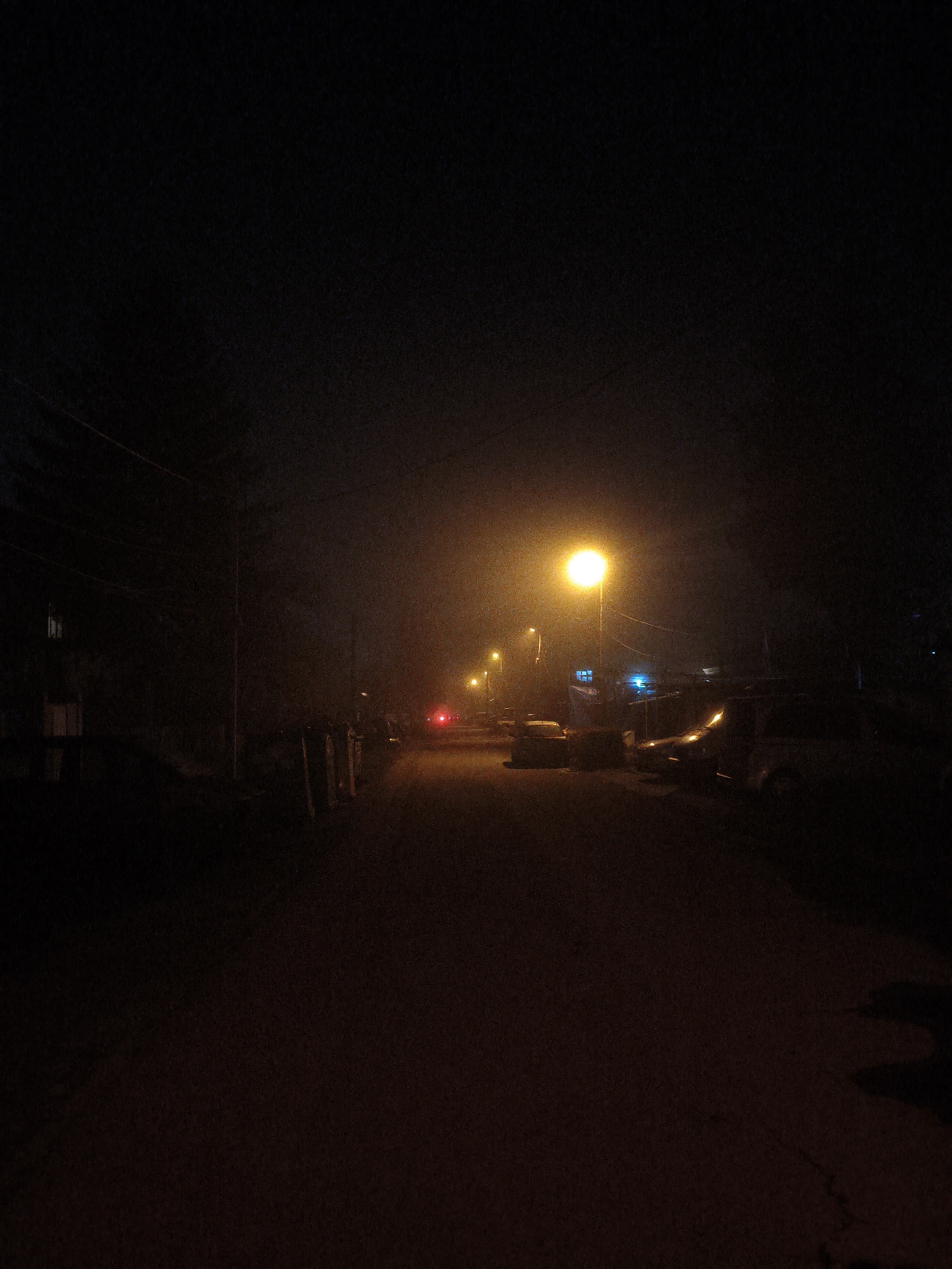 The image depicts a dark, poorly lit street at night
