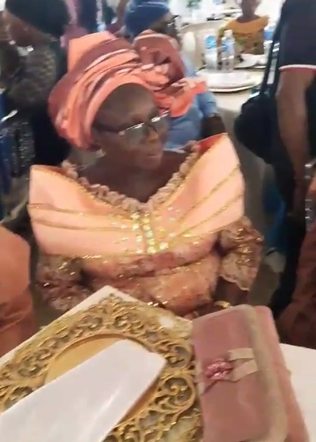 gathering of people, possibly at a wedding or celebratory event. Most of the individuals are wearing traditional African attire. A man in an orange outfit is presenting photos to a woman wearing a matching headwrap and clothing. They're seated at a table decorated with gold-colored placemats and white napkins. Other attendees are also seated around the table, dressed in similar vibrant outfits. A mobile phone is visible on the table next to a small clutch purse. A man walks past in the background wearing a navy shirt with white and red stripes.