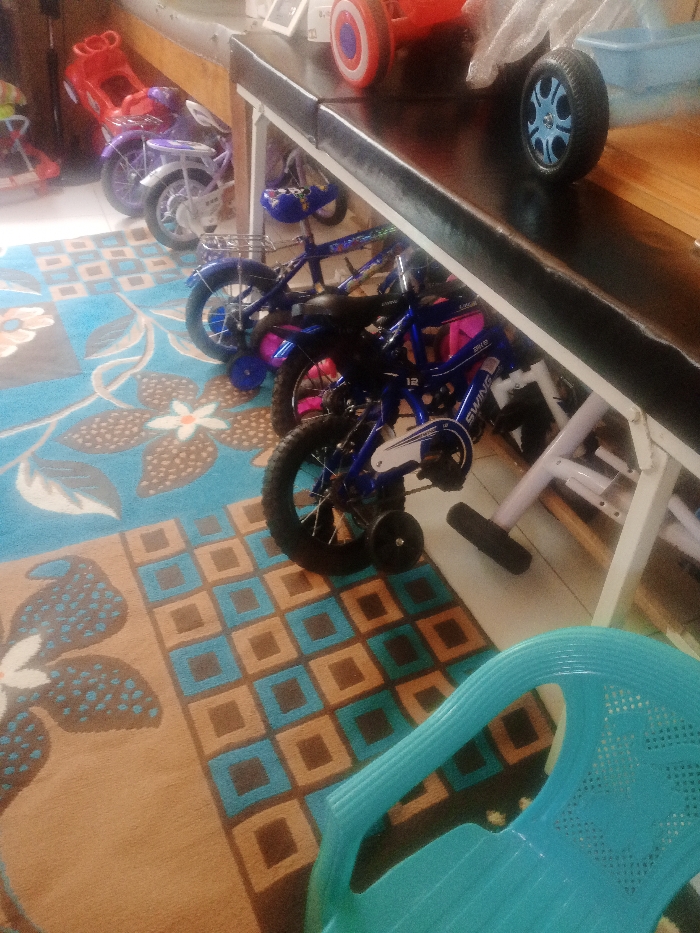 This image depicts an indoor scene within a commercial or storage space in Kakamega, Kenya, displaying multiple children's toys and equipment. The floor is covered by a multi-patterned rug featuring sections with large light blue, brown, and white floral designs, and other sections with a grid of smaller alternating light blue and brown squares. Arranged against a light-colored wall are several children's vehicles. In the background on the left, two purple children's motorcycles or ride-on toys are visible. In front of these, a line of blue children's bicycles with training wheels extends towards the foreground. One blue bicycle clearly shows "SWING" on its frame and "12" beneath it, along with a small front basket. A long, dark-surfaced table or counter with a black padded edge extends horizontally across the upper mid-section of the image, supported by white metal framing underneath. On top of this table, various items are stored, including a red and white toy car or ride-on toy and a blue toy wheel with a six-spoke design. Some items on the table are partially obscured by clear plastic sheeting. In the lower right foreground, a portion of a light blue plastic chair is visible. No individuals are present in the scene, and no active interactions or actions are depicted.