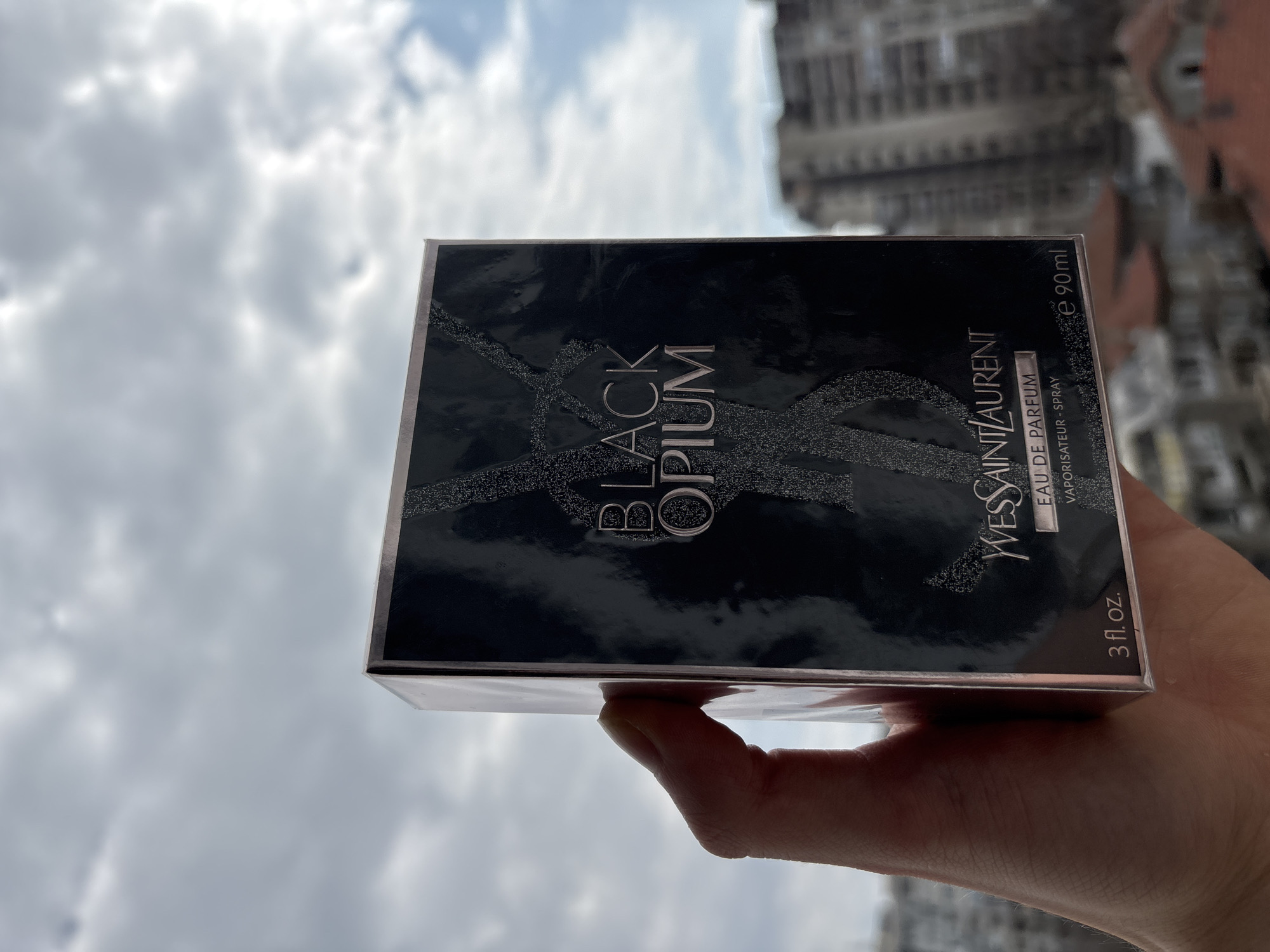 A light-skinned hand holds a vertically oriented, rectangular retail box for "Yves Saint Laurent Black Opium Eau de Parfum," 90 ml (3 fl