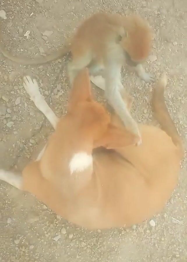 n orange dog with a white patch on its chest lying on the ground. A monkey is perched on top of the dog, seemingly interacting with it. The ground is covered with dirt and small pebbles. The video is slightly blurry, and the lighting is somewhat dim. A TECNO CAMON 17 watermark is visible in the bottom left corner.