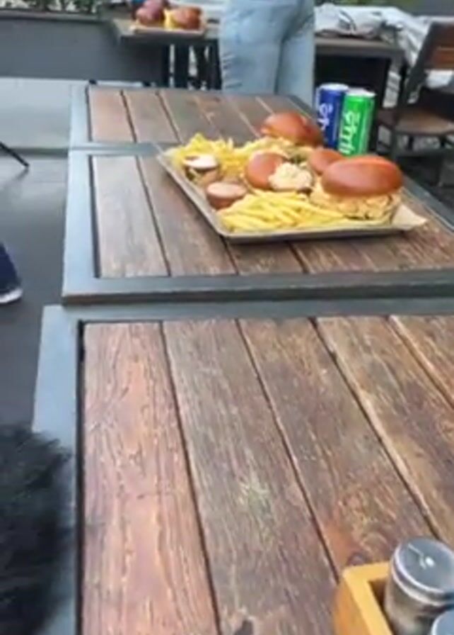 food photography shoot taking place outdoors. The focus is on a wooden table on which a metal tray of burgers and fries sits, along with small containers of sauce. In the background, other wooden tables are visible, one with beverages. Two people stand near the tables. A man in a teal sweater and blue jeans is preparing to film the food using a RONIN camera mounted on a stabilizer. A black coat with fur trim rests on a chair next to him. There are light stands visible in the background. The scene appears to be on a patio or in an outdoor dining area.