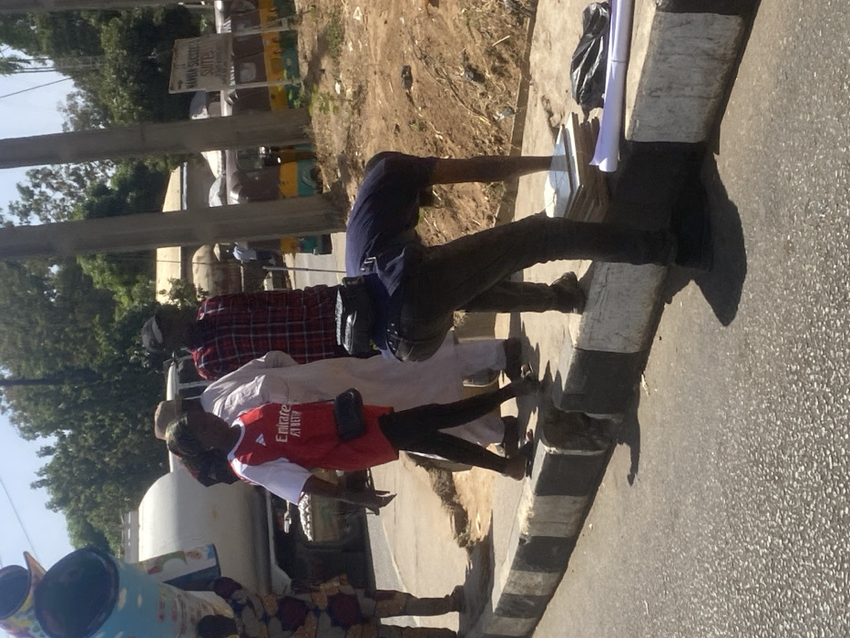 The image depicts a daytime street scene in Jos, Nigeria. In the immediate foreground right, a male individual, dressed in a dark blue short-sleeved shirt and dark trousers, is bent over at the waist, reaching towards a stack of white square objects, possibly tiles, and several rolled white papers resembling blueprints or schematics, positioned on the concrete sidewalk and the black and white striped curb. A black fanny pack is worn around his waist. To his left, on the sidewalk, a person, likely female, wearing a red and white Arsenal football club jersey with "Emirates FLY BETTER" branding, black leggings, and light brown shoes, walks towards the left of the frame. She carries a small black cross-body bag. Directly behind her stands an individual dressed in a light-colored traditional Nigerian garment and a light-colored cap. Further behind this person, another individual wears a red and black plaid shirt and a black baseball cap. On the far left, a person, possibly a child, in a colorful patterned outfit is partially visible. The scene features a two-tone black and white striped curb separating the asphalt road from the concrete sidewalk, which shows some wear. In the background, a large white tanker truck is visible on the road. Further back and to the right, several yellow and green auto-rickshaws (Keke Napeps) are parked or moving. A white sign with dark lettering, partially obscured by utility poles, reads "MAMBA SUCCESS SUITES." The environment is brightly illuminated by sunlight, casting sharp shadows from the individuals and objects. Green trees and foliage are present in the mid-ground and background, along with additional utility poles and distant structures.