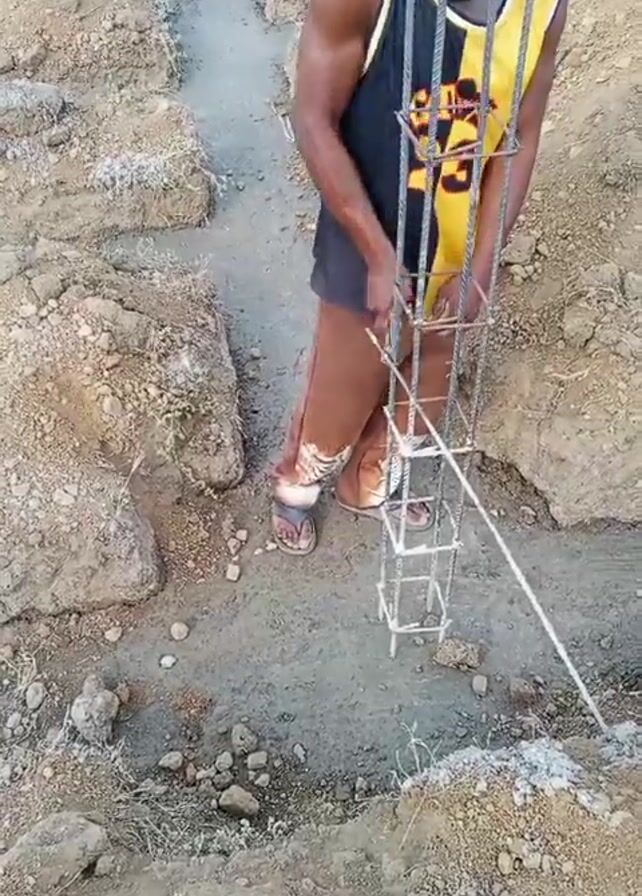 A man is shown outside working at a construction site. He wears a black and yellow tank top with the number 23 and the word CAVS on it. He also wears brown pants and sandals. He stands in the middle of a trench, holding a metal rebar cage. He points a thin metal rod downward, possibly to mark something in the dirt. The trench is narrow and filled with a mix of dirt, mud, and small stones. The surrounding ground is uneven and covered in dirt and rocks.
