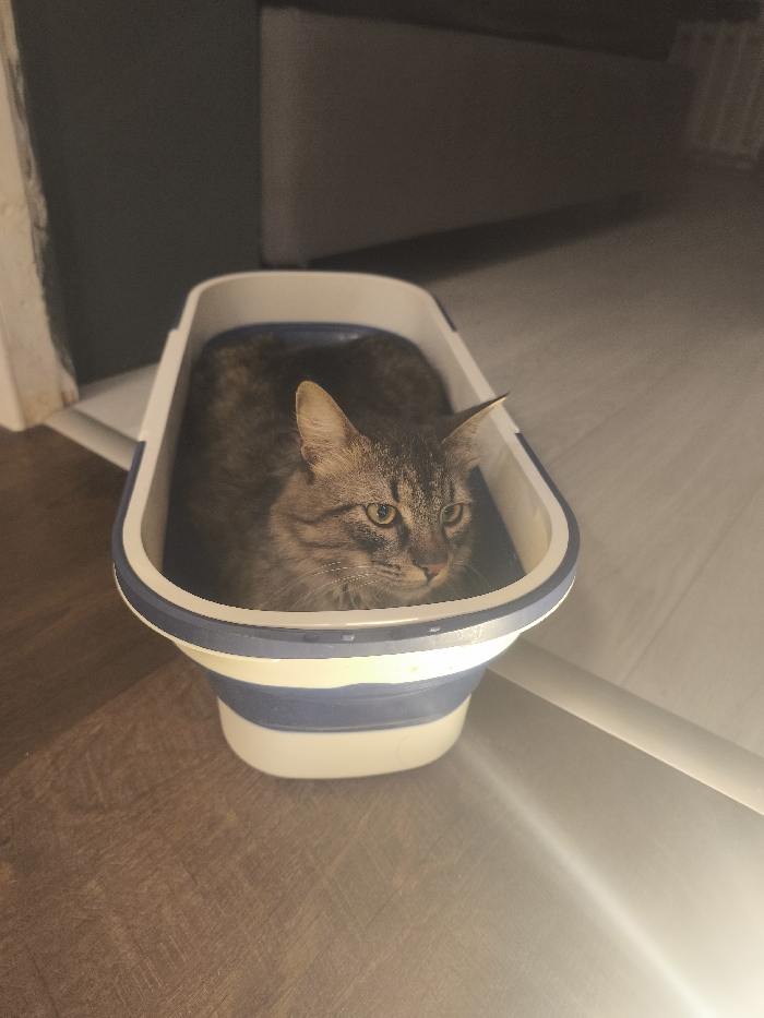 - "An indoor scene in Sofia, Bulgaria, features a single domestic tabby cat resting within a white and blue collapsible rectangular tub" by FM-xpnhQ2, licensed under CC BY 4.0
