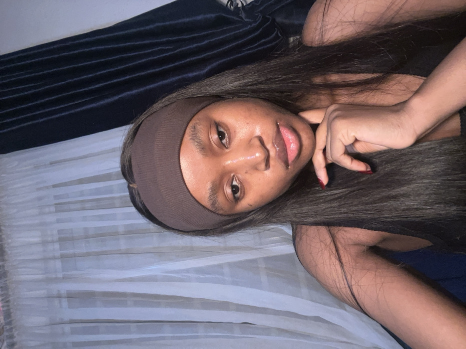 A young woman with long, straight black hair and a brown headband is lying on a bed with white sheets and a blue blanket. She is wearing a black top. Her skin appears smooth and has a slight shine. She has full lips and her fingers are adorned with red nail polish. She is gazing directly at the camera with a relaxed expression.