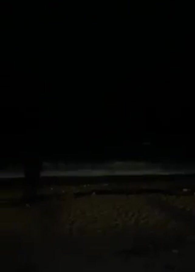 nighttime beach scene with waves and a person. The beach sand is visible in the foreground and is lit by a light source. A person walks into view at the center of the frame and disappears off to the left. The ocean is in the background with white waves visible along the shore. The rest of the scene is dark.