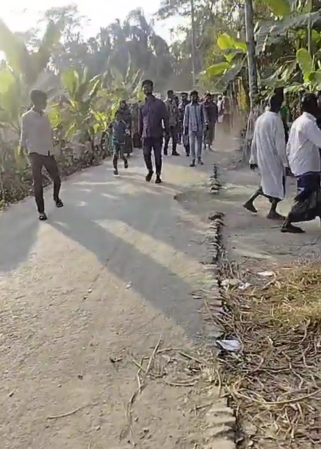 group of people walking down a dirt road in a rural area. The road is lined with trees and vegetation, and there are some houses visible in the background. The people are of various ages and are dressed in casual clothing. Some are walking in small groups, while others are walking alone. The camera is held by someone who is walking with the group, and it pans around to show the different people and the surrounding environment. The sunlight is bright, casting long shadows on the road.