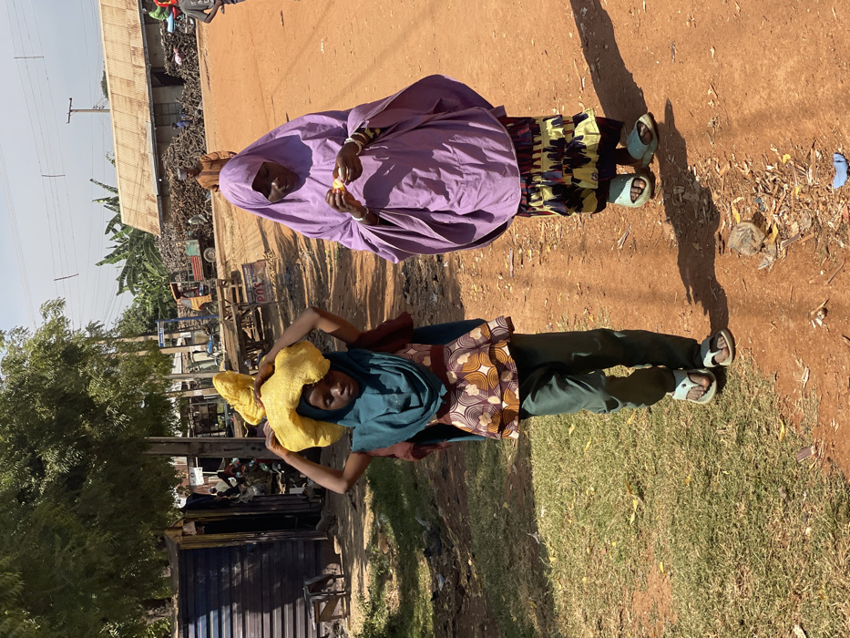 The image presents a daytime street scene in Unguwar Gabas, Nigeria. Two females walk from left to right on a reddish-brown dirt path. The younger female on the left wears a teal head covering, a multi-patterned peplum-style top, dark green trousers, and light blue flip-flops. She balances a lumpy yellow object on her head, steadying it with both hands. The adult female on the right wears a light purple full-body hijab/khimar over a dark patterned skirt and light blue flip-flops. She holds a small, light-colored item in her hands, appearing to consume or prepare it, and has several white bracelets on her left wrist. Both cast distinct shadows to their right on the path. The path itself contains scattered litter. To the left of the path, a patch of green grass is visible, behind which stands a dark blue corrugated metal structure and green trees. Further into the midground, a wooden stand and a "POS" sign are visible. The background features utility poles, more green foliage, a yellow tractor with a green trailer, a large pile of wood or branches, and buildings with corrugated metal roofs. Other indistinct figures and parked motorcycles are visible in the distant background under a bright, clear sky.