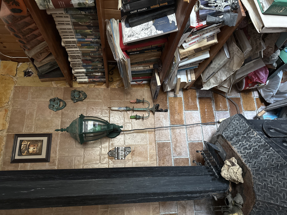 The image depicts an indoor corner of a room located in Binyamina, Israel, characterized by a rustic and densely decorated aesthetic. The walls are primarily covered with rectangular, textured tiles resembling varying shades of brown and tan brickwork, transitioning to rough, light-colored stone or plaster at the upper wall junction. On the left side of the frame, a tall, dark, square-profile column, likely a stovepipe or structural beam, extends vertically. Below it, a dark-colored, heavy-duty stove or fireplace insert with a diamond plate pattern on its top surface is present. Resting on the stove are a small, dark metal model of a ship, an irregularly shaped piece of light-colored rock or coral, and a small brass container along with other indistinct metallic objects. Mounted on the tiled wall is a large, dark green, antique-style wall lantern with glass panels, from which a black electrical cord descends. Above the lantern, a rectangular framed picture depicting an architectural scene is affixed. To the right of the lantern, two small, weathered green metallic masks, resembling theatrical tragedy and comedy masks, are wall-mounted. Below the lantern, a small decorative tile depicting a building facade is visible, and further down, an ornate dark metal two-arm candelabra holds two partially consumed, multi-colored candles. The right side of the image features multiple wooden shelves built into the corner, densely packed with books. The books, many appearing to be hardcovers, display various spine colors, and several visible titles are in Cyrillic script. Books are arranged both vertically and horizontally, interspersed with stacks of papers, maps, and other miscellaneous items. On a lower shelf, a small bust sculpture and an ornate metallic object are visible. The floor area beneath the lowest shelf appears cluttered with items including a red bucket and plastic bags. No individuals are present in the scene.