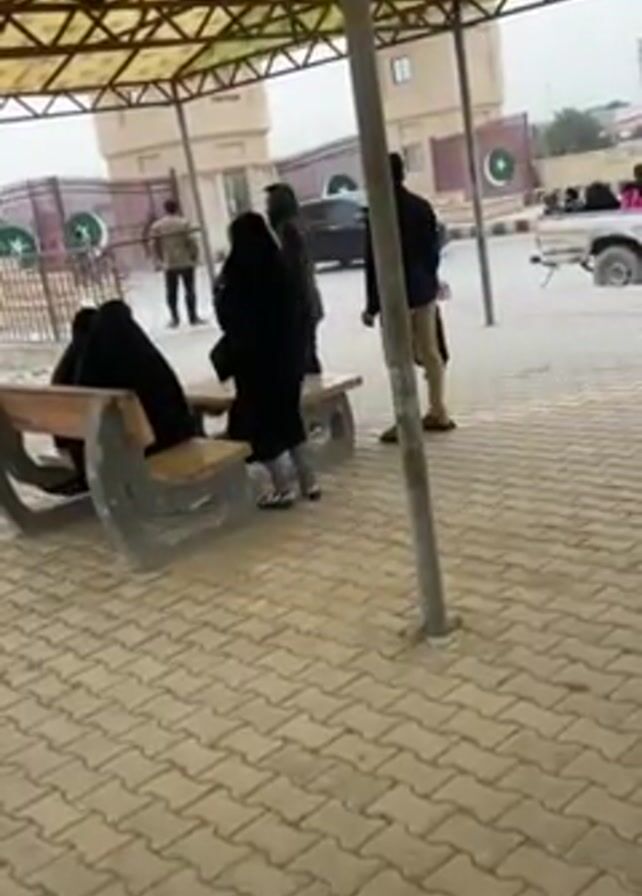 The scene depicts a public area under a covered structure with a beige brick-patterned floor. Several people are present. Two individuals clad in black burkas sit on a concrete bench with a wooden seat. Another person in black stands near the bench. To the right, a man in a dark jacket and light-colored pants stands facing away from the camera. In the background, there's a gated entrance with green and white emblems, possibly logos. A white pickup truck is parked further back. Other people can be seen near the gate and by the truck. The sky is overcast, creating a diffused, soft light.