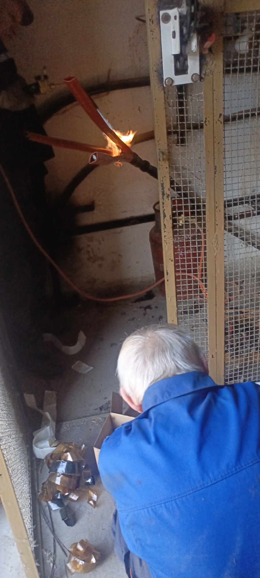 A man wearing a blue shirt is near a box and scattered packaging. In the background, flames are visible near orange pipes or tubes. Behind the flames, there is a caged area with a red propane tank inside. The setting appears to be an indoor or enclosed workspace.