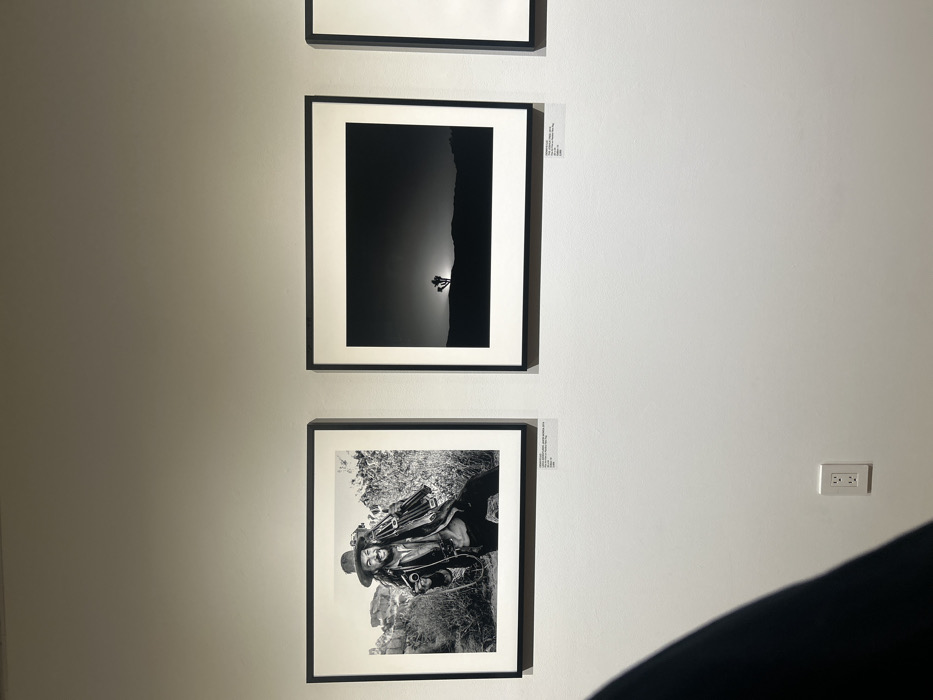 Three black and white framed photos hang vertically on a white wall. The top photo is only partially visible. The middle photo depicts a dark landscape with a silhouetted figure. The bottom photo shows a man in a hat holding a weapon, possibly a rifle, against a rocky, outdoor backdrop. A small white electrical outlet is on the wall, and part of a black object or person is visible at the bottom right corner.