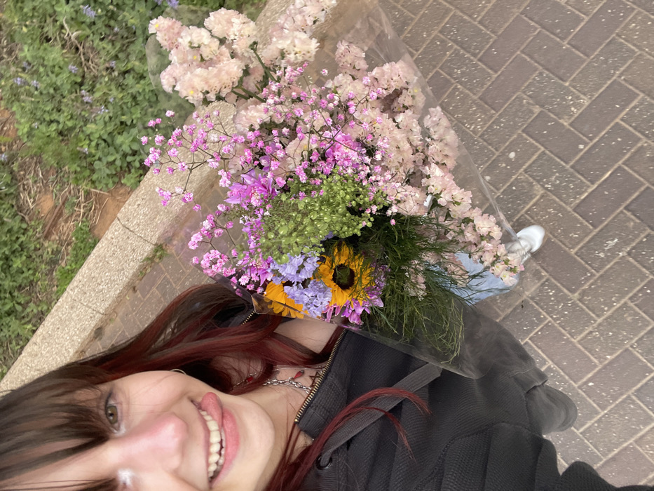 A selfie shows a smiling woman with red-highlighted brown hair holding a large bouquet of flowers