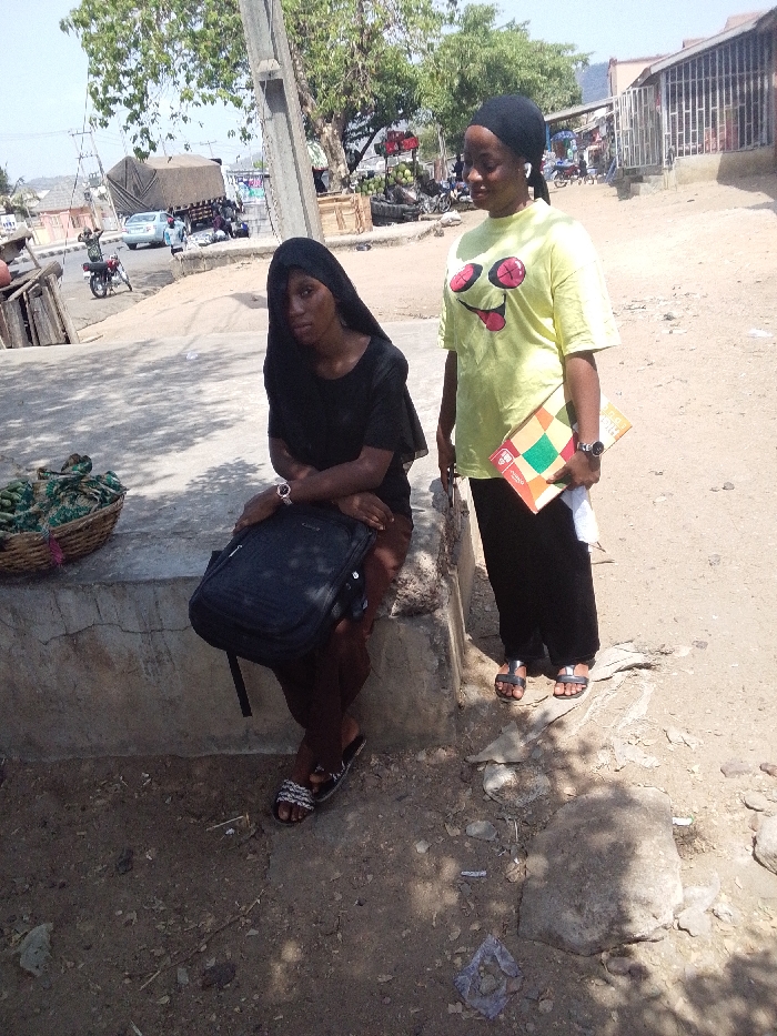 Two young women stand outdoors. One sits on a concrete ledge, clad in black and with a black head covering, resting a black backpack on her lap. A woven basket filled with green produce sits to her left. The other woman, standing, wears a light yellow t-shirt with a cartoon face, black pants, a black head covering, and holds a colorful notebook. They are on the side of a dirt road or street, with buildings and some traffic visible in the background.