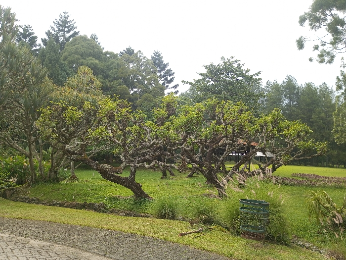 A picturesque outdoor scene features gnarled trees with green foliage dominating the foreground. Lush green grass covers the landscape, interspersed with patches of taller grasses and a glimpse of a dark green trash receptacle. In the distance, a structure with a dark roof is visible. The background is filled with a dense forest of varying green trees, creating a serene and natural setting. The sky is overcast.