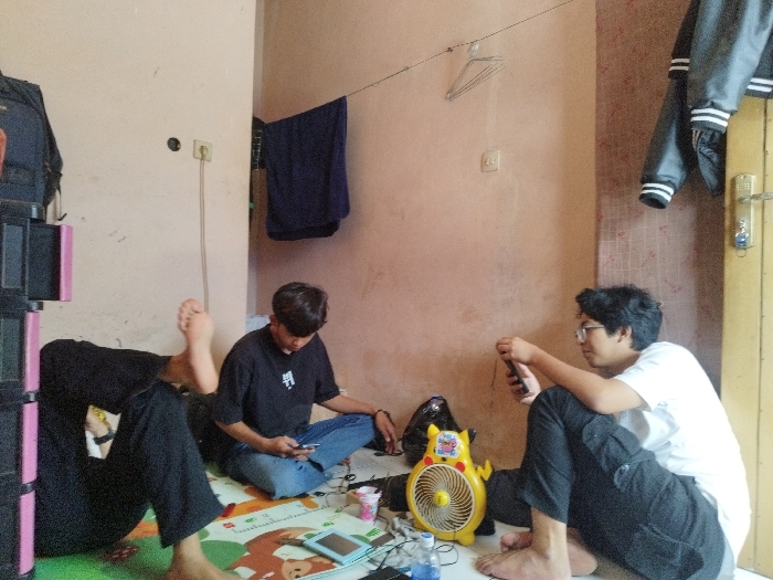 The image captures an indoor room in Muka, Indonesia, featuring light peach-colored walls and a patterned floor mat. Three individuals are present, all barefoot. On the far left, a person, largely obscured by a black and pink multi-tiered shelving unit, is visible wearing black pants with their feet extended upwards. A dark backpack rests atop the shelving unit. In the center, a male with short dark hair, wearing a black t-shirt and blue jeans, sits cross-legged on the mat, looking down at a smartphone held in his hands. To his right, another male with dark, medium-length hair and glasses, wearing a white t-shirt and black cargo pants, sits with bent knees, holding and observing a smartphone. The room contains a yellow Pikachu-themed electric fan positioned on the floor mat near the individual in the white t-shirt. Also on the mat are multiple cables, a small white cup, a blue water bottle, a black plastic bag, and a tablet-like device. The walls display an electrical outlet with a plugged-in cable, a strung wire supporting a metal clothes hanger, and a light switch plate. A blue towel or garment hangs on a hook in the upper right corner, adjacent to a light brown wooden door with a visible silver handle and bolt lock. A black jacket with white-striped sleeves hangs near the door.