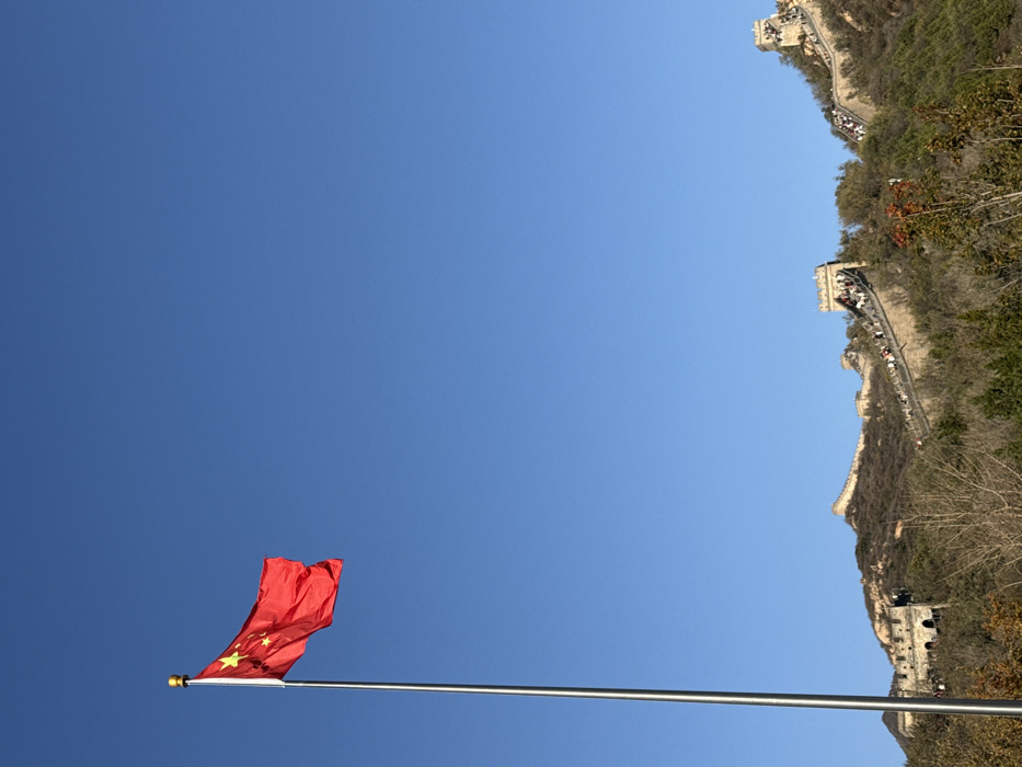 The image depicts a segment of the Great Wall of China situated in Yanqing District, China, under a clear, bright blue sky. In the lower-left foreground, a tall, metallic flagpole with a golden finial stands vertically, presenting the red national flag of China, emblazoned with five yellow stars, waving towards the right due to wind. The flag is positioned against the expansive blue sky, which dominates the upper two-thirds of the frame. In the midground and background, the ancient stone fortifications of the Great Wall are visible, traversing rugged, vegetated mountainous terrain. Multiple watchtowers or fortified sections are integrated into the wall structure. Numerous small human figures, indicative of tourists, are observable walking along the wall sections and congregating near the watchtowers. The hillsides are covered with deciduous trees and shrubs, displaying a mix of green and autumnal brown/red foliage. The scene suggests a clear day with good visibility, highlighting the architectural scale of the wall and the presence of visitors.