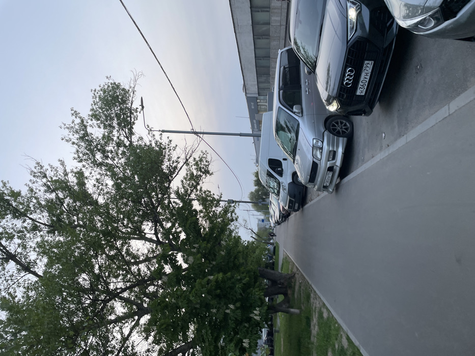paved path in a residential area of Moskva, Russia, at latitude 55.649 and longitude 37.501. The path runs alongside a row of parked vehicles. The vehicles are parked on the right side of the path. The vehicles include a white van, a silver minivan, a dark gray SUV, and a silver car. The SUV has a license plate with the letters "H360YH792". The path is lined with green grass. A large tree is on the left side of the image and its branches extend over the path. The sky is pale blue and partly cloudy. The image was taken in the late afternoon. The weather is pleasant and clear. There are no people visible in the image. The image was taken from a slightly elevated position looking towards the end of the path. There are power lines running across the top of the image. There is a streetlamp in the middle of the image.