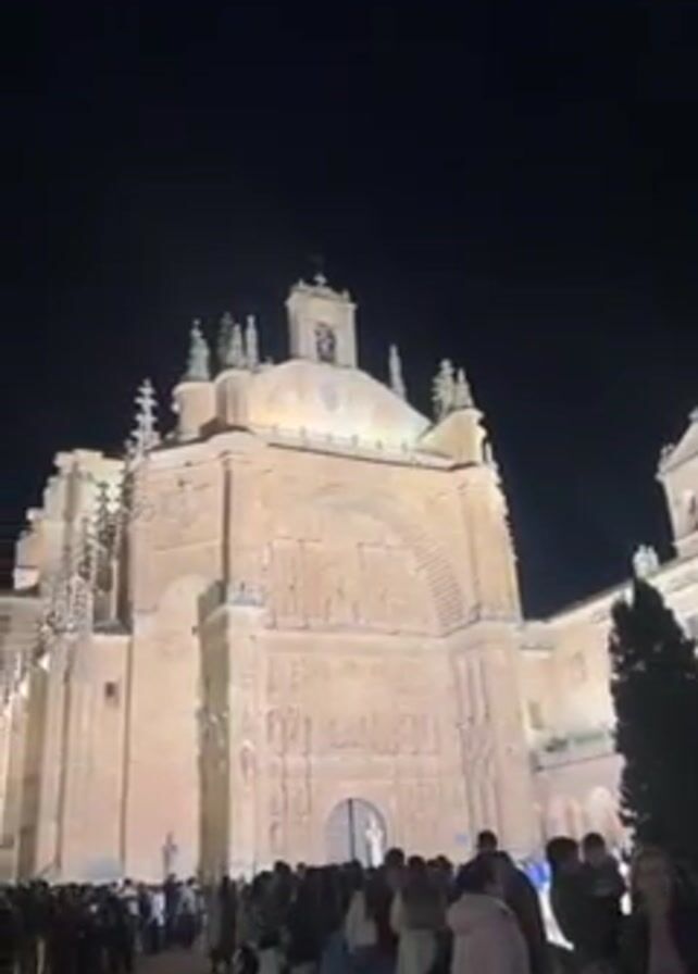 large, light-colored stone building, possibly a cathedral or university, at night. The building is well-lit, highlighting its architectural details. A large crowd of people is gathered in front of the building, suggesting an event or gathering. Some people are standing still, while others are moving around. Two tall, thin trees and a statue are also visible near the crowd. The sky is dark and clear.