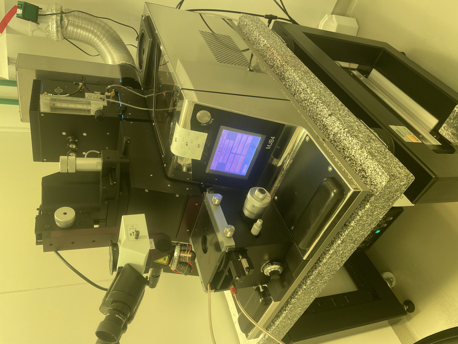 The scene is a cleanroom laboratory in San Carlos de Bariloche, Argentina, illuminated uniformly by yellow-amber light. The primary subject is an MJB4 mask aligner, a precision photolithography tool, resting on a speckled grey anti-vibration table supported by a black metal frame. The mask aligner is a multi-component system featuring a black main body with polished silver accents. On the left, an "Olympus" branded microscope is positioned over a mechanical stage that includes a central circular aperture and multiple adjustment knobs. To the right, the control unit displays "MJB4" and features an illuminated LCD screen with a blue background and pink graphical elements. A small, crumpled white paper label with handwritten numbers is taped above the screen, and an "ON OFF" switch is adjacent to it. Above the main unit, a black housing contains optical and mechanical components, including a visible flow meter with a float. A flexible metallic corrugated duct extends from the upper right side of this housing, connected to a white ventilation component and secured by a green clip, rising out of frame. Various cables and tubes are connected to the equipment. No individuals are present in the image.