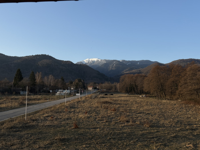 The image depicts a panoramic view of a rural landscape in Dolna Banya, Bulgaria, under a clear blue sky. In the foreground, a vast expanse of dry, brown, dormant grassland extends across the bottom half of the frame. A two-lane paved road, light grey in color, originates from the lower-left, curves slightly right, and proceeds into the mid-distance. Several white marker poles are spaced along the left edge of this road. To the left of the road in the mid-ground, a sparse cluster of residential or utility structures with varying roof colors is visible, flanked by several dark green conifer trees. To the right of the road, a dense line of deciduous trees with bare, brown branches runs parallel to the road, casting long shadows to the left. In the background, multiple layers of mountains dominate the horizon. The closer mountain ranges are dark green and brown, densely forested. Behind these, taller peaks feature visible snowcaps, particularly a prominent white peak centrally located in the upper background. No individuals, vehicles, or discernible animal life are present. The lighting suggests either early morning or late afternoon, with sunlight coming from the right, illuminating portions of the landscape and casting shadows. The image is framed from a slightly elevated vantage point, indicated by a dark brown structure partially visible across the very top edge.