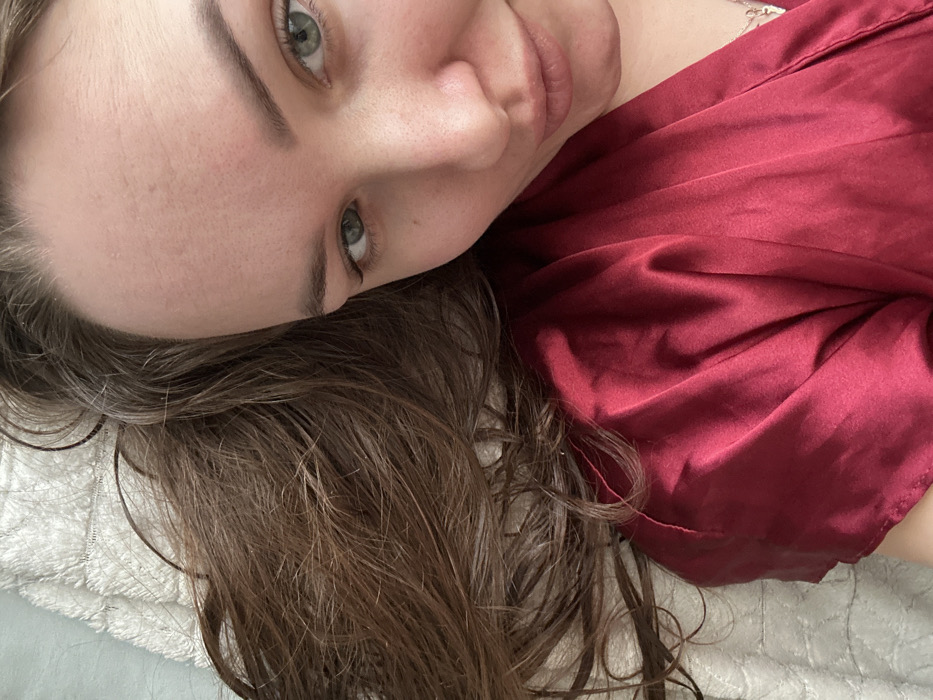 This image captures a close-up, top-down perspective of a female individual lying down, looking towards the camera, presumed to be within the city of Chaikovsky, Russia