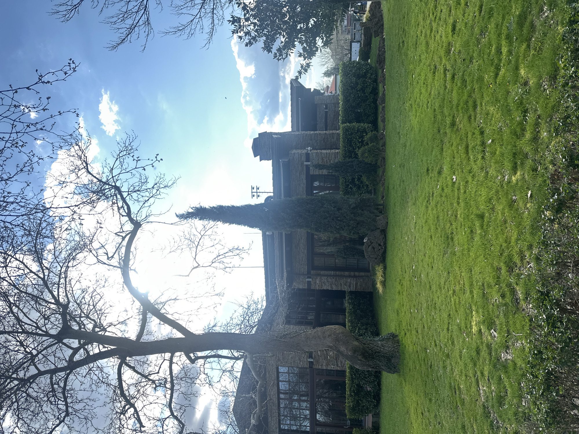 stone building in Svilengrad, Bulgaria. A large, bare tree dominates the foreground, partially obscuring the building. The building appears to be multi-storied, constructed with roughly-hewn stones. Green grass covers the ground in front of the building, bordered by hedges. The sky is blue with scattered clouds.