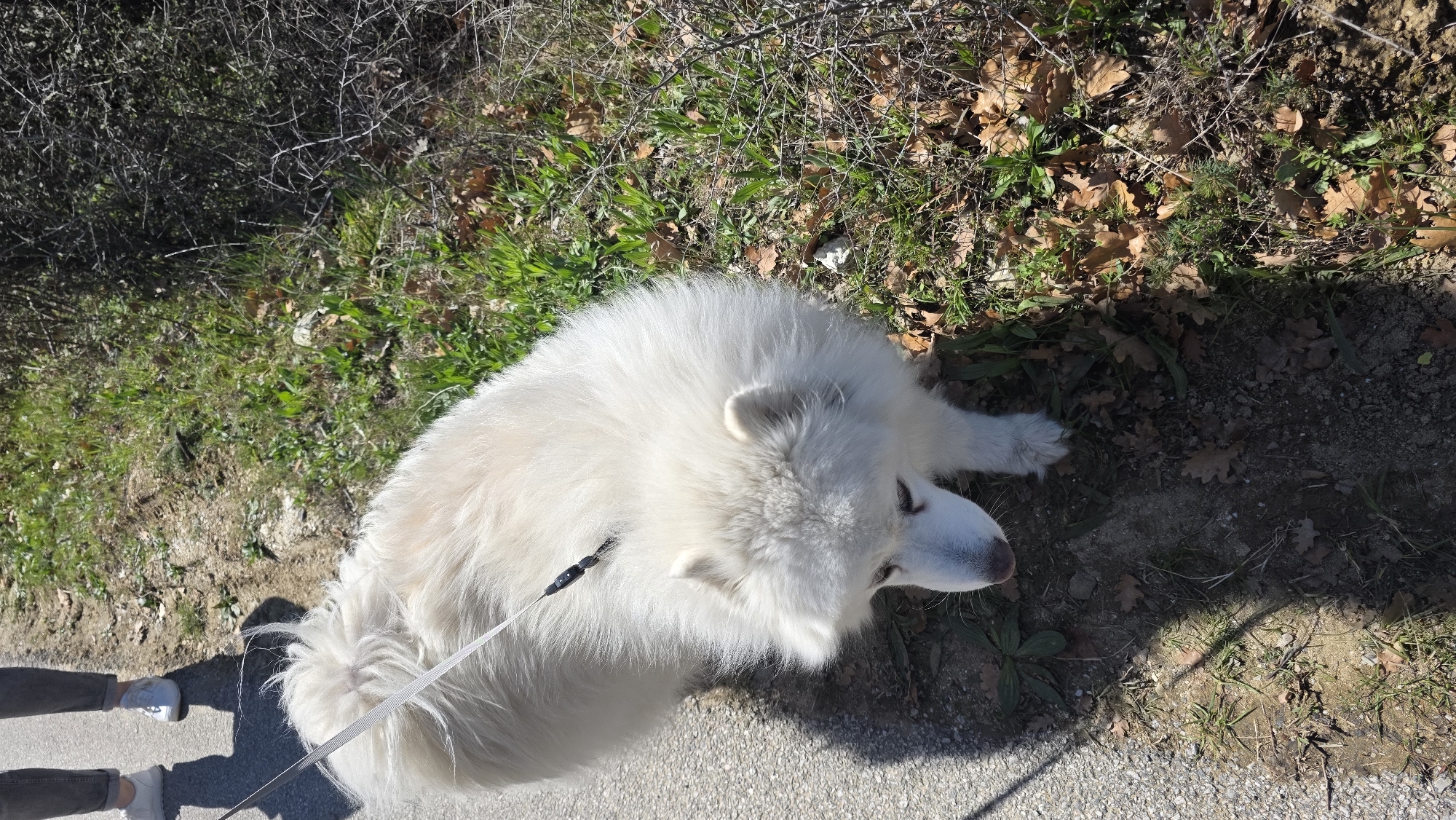 white Samoyed dog on a leash, lying on a concrete pathway. The dog is positioned near the edge of the path where it meets the ground, which is covered with patches of grass, dead leaves, and soil. A person's legs and feet are visible in the bottom left corner of the image. The setting appears to be a natural area with trees and vegetation, possibly in Marulevo, Bulgaria. The photo is taken from a high-angle perspective, looking down at the dog.