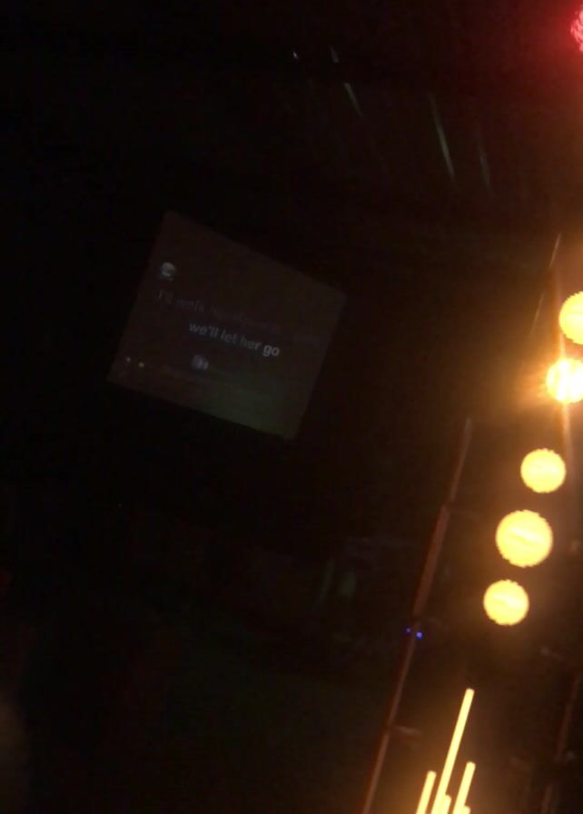 dark indoor setting, possibly a bar or entertainment venue, with a screen displaying karaoke lyrics