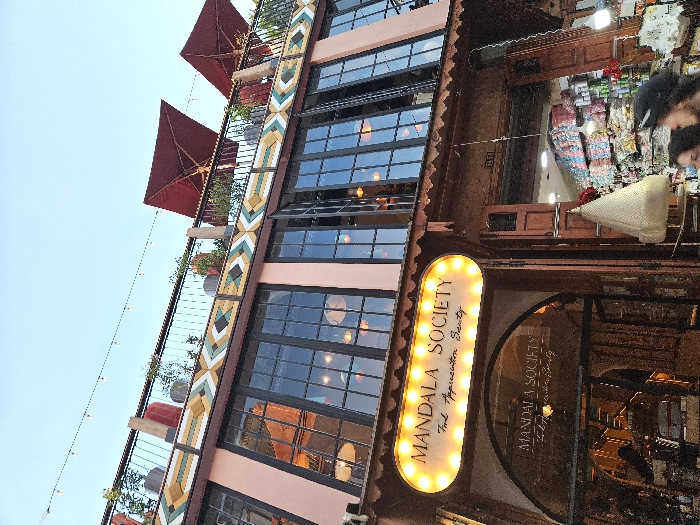 A multi-story building with a vibrant facade. Black-framed windows reflect the sky and interior lights. Red shade structures top the building. A patterned balcony adds intricate detail. A bright, vertically oriented sign reads "MANDALA SOCIETY" in capital letters. Inside the building is a shop, possibly a gift store, as evidenced by the colorful items on display. People are partially visible near the shop entrance.