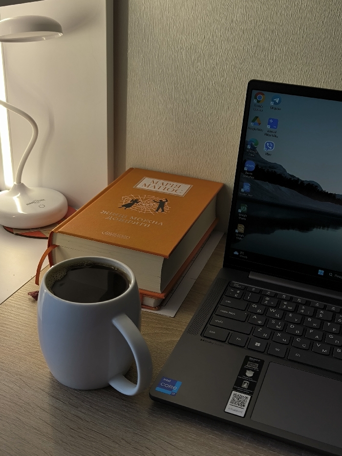 An indoor scene, presumably a desk in a room located in Vinnytsia, Ukraine, is depicted with a focus on work and study materials. The primary objects include a white ceramic mug filled with a dark liquid, likely coffee or tea, positioned on a light wood-grained desk surface in the foreground. To its right, a dark gray laptop is open, displaying a desktop screen with various application icons and a tranquil landscape wallpaper featuring mountains and a body of water. The laptop's keyboard shows Cyrillic characters, and its palm rest features an "Intel Core i7" sticker, a "Dolby Atmos" logo, and a larger sticker containing a QR code, technical specifications, and text including "ВІДНОВИТИ ВІННИЦЯ" (Restore Vinnytsia) and "ГАРАНТІЯ 12 МІСЯЦІВ" (12 Months Warranty). Behind the mug and partially underneath the laptop, a stack of books is present, with the topmost book being a prominent orange hardcover volume. This book features an orange ribbon bookmark and displays the author's name "МАРІЯ МАТІОС" (Maria Matios) and the title "ЖИТИ МОЖНА ДОВЖЕ" (Life Can Be Longer) on its spine and cover. The cover also illustrates a spiderweb with two human figures. To the far left, a white modern LED desk lamp with a gooseneck design and a circular base, bearing the "NANOTEX" brand name, emits a bright vertical light, illuminating the immediate area. The background consists of a textured, light-colored wallpaper. No individuals are visible in the scene.