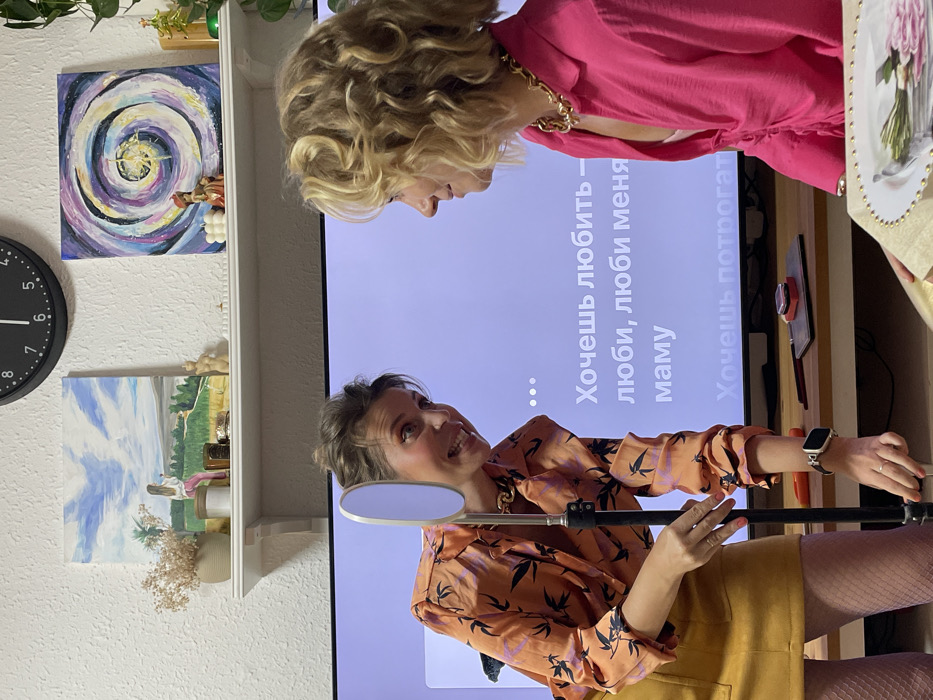 Two women are facing each other in front of a television displaying text in Russian