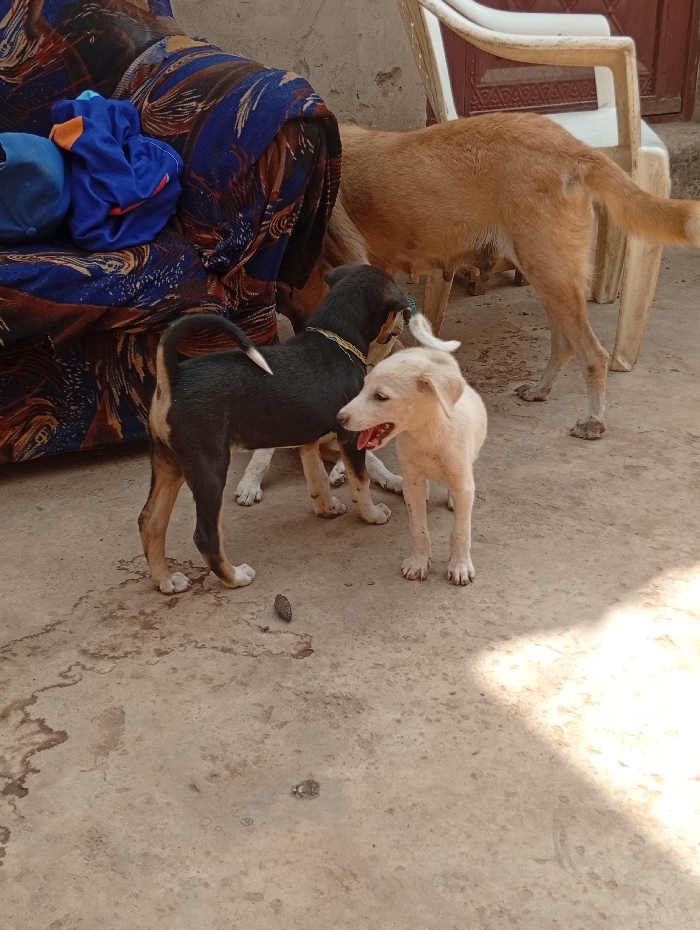 The scene depicts an outdoor concrete area in what appears to be a residential or semi-urban setting within Abuja, Nigeria. No specific street or landmark identifiers are visible. In the foreground and mid-ground, four canines are present. A tan-colored adult dog, possibly a lactating female given visible teats, stands in the mid-ground, partially obscured by a patterned sofa and two puppies. Its rear section and hind legs are visible. To its left, a black puppy with tan-white markings on its legs and chest wears a thin gold-colored collar. It faces right. To the right of the black puppy, a cream-white puppy with an open mouth, possibly panting or vocalizing, faces left. Both puppies are standing on the concrete. The front paws of at least one other dog, possibly another puppy, are visible further back between the two main puppies. To the far left, a worn, heavily patterned armchair or sofa, upholstered in blue, brown, and orange fabric, is positioned. Blue fabric items, one with an orange accent, are folded or piled on the sofa. In the background, behind the tan adult dog, a white plastic monobloc chair is partially visible next to a light-colored wall. The concrete ground is discolored with numerous dark stains and patches. Two small, dark, irregular objects resembling animal feces are present on the concrete in the mid-ground. The area is illuminated by strong natural light from the right, creating a distinct diagonal shadow line across the ground.