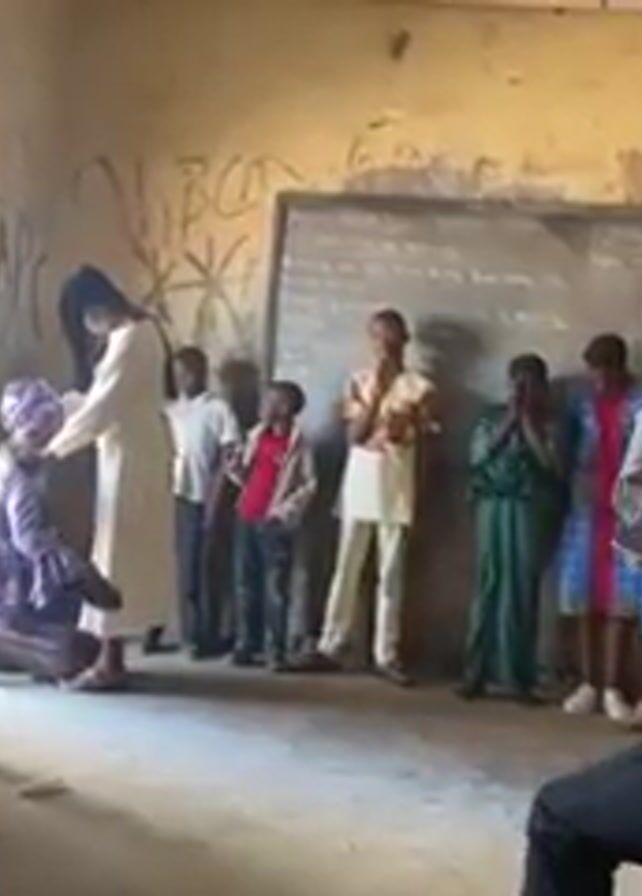 The interior of a classroom is visible in this video. The walls are stained and have graffiti on them. A blackboard is at the back of the room with writing on it. A group of about 10 children of varying ages stand near the blackboard. A woman in a white dress and a woman in purple kneel together. The woman in white appears to be assisting or praying with the woman in purple. Some of the children have their hands raised, seemingly in prayer or reverence. A man wearing a black shirt and holding a phone sits at the edge of the frame, observing the scene. There are some desks and chairs in the room. The lighting in the room seems dim and natural, coming from a window visible on the left side.