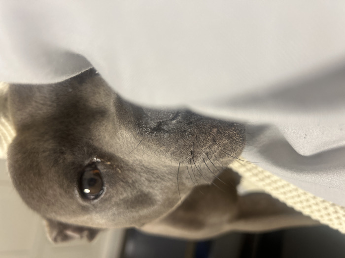 This image depicts a close-up of a domestic dog, located indoors in the city of Corrimal, Australia. The animal is a short-haired dog with grey fur, resting on bedding. Its head is prominent in the foreground, with its right eye clearly visible, exhibiting a dark brown iris and a round pupil. Minor discharge is present near the inner canthus of the right eye. The dog's muzzle is partially obscured by a light grey sheet or blanket in the immediate foreground. Several whiskers are visible extending from the muzzle area. Behind the dog's head, a cream-colored, textured blanket or throw is visible, and the background is dark and out of focus. The dog is positioned lying down, with its gaze directed towards the viewer. No other subjects or specific objects are clearly discernible.