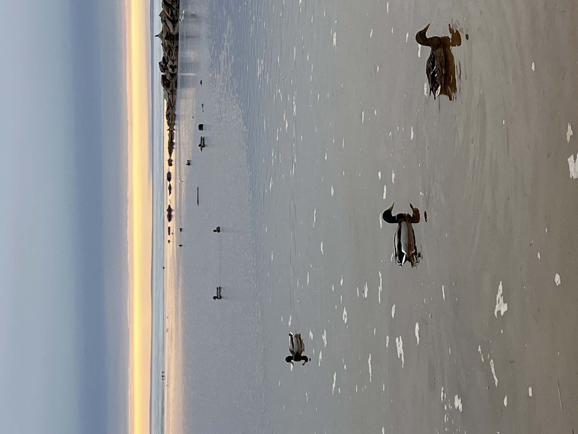 The image depicts a body of water, likely a bay or lake, near the city of Sestroretsk, Russia, at dawn or dusk, as indicated by the gradient in the sky. Several ducks are visible on the water's surface. Some are closer to the viewpoint, while others are further away, closer to a rocky shoreline. The water is partially covered with patches of ice or foam, suggesting a cool temperature.