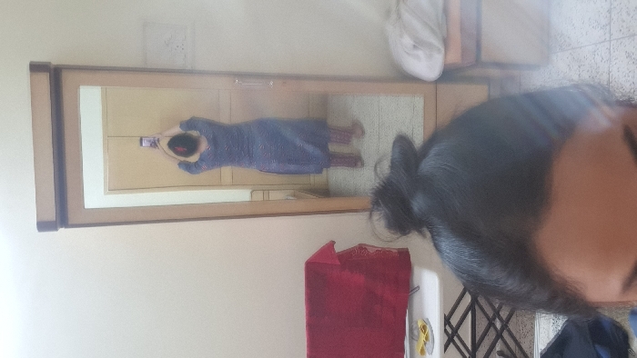 This image depicts an indoor domestic scene in Kolkata, India. In the foreground, the top portion of a person's head, featuring dark hair pulled back into a bun, is partially visible, indicating the photographer's perspective. The central subject is the reflection of an individual in a large, vertically oriented mirror with a light wooden frame. The reflected person is viewed from the back, wearing a dark blue patterned kurta and maroon-colored pants, holding a dark smartphone with both hands raised above their head to capture a mirror selfie. The reflection behind this individual shows light brown wooden wardrobe doors. To the left of the mirror, a small white rectangular table with a black X-frame base is present, holding a draped red translucent fabric and a pair of yellow and white slippers. The room features plain, light-colored walls and a light-toned, speckled tiled floor. To the right of the mirror, a light-colored item, possibly a cloth, rests on a low wooden box or stool.